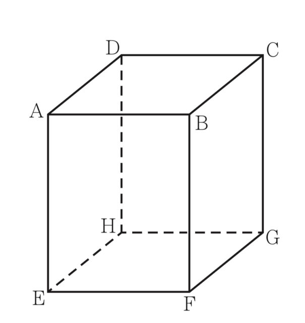 解説 : 辺AEとねじれの位置にあるのは, 辺に平行でも交わってもいない辺. 辺AEとねじれの位置にあるのは, 辺FG, 辺DC, 辺HG, 辺BC