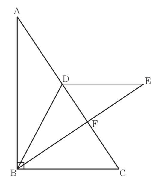 右の図において, △ABCは∠ABC=90 の直角三角形であり, AB=3cmである. Dは, 辺AC上にあってA, Cと異なる点である. EDB=△ADBであり, DE // BCである. Fは, 辺EBと辺ACとの交点である. BC = x cmとし, x>0とする.